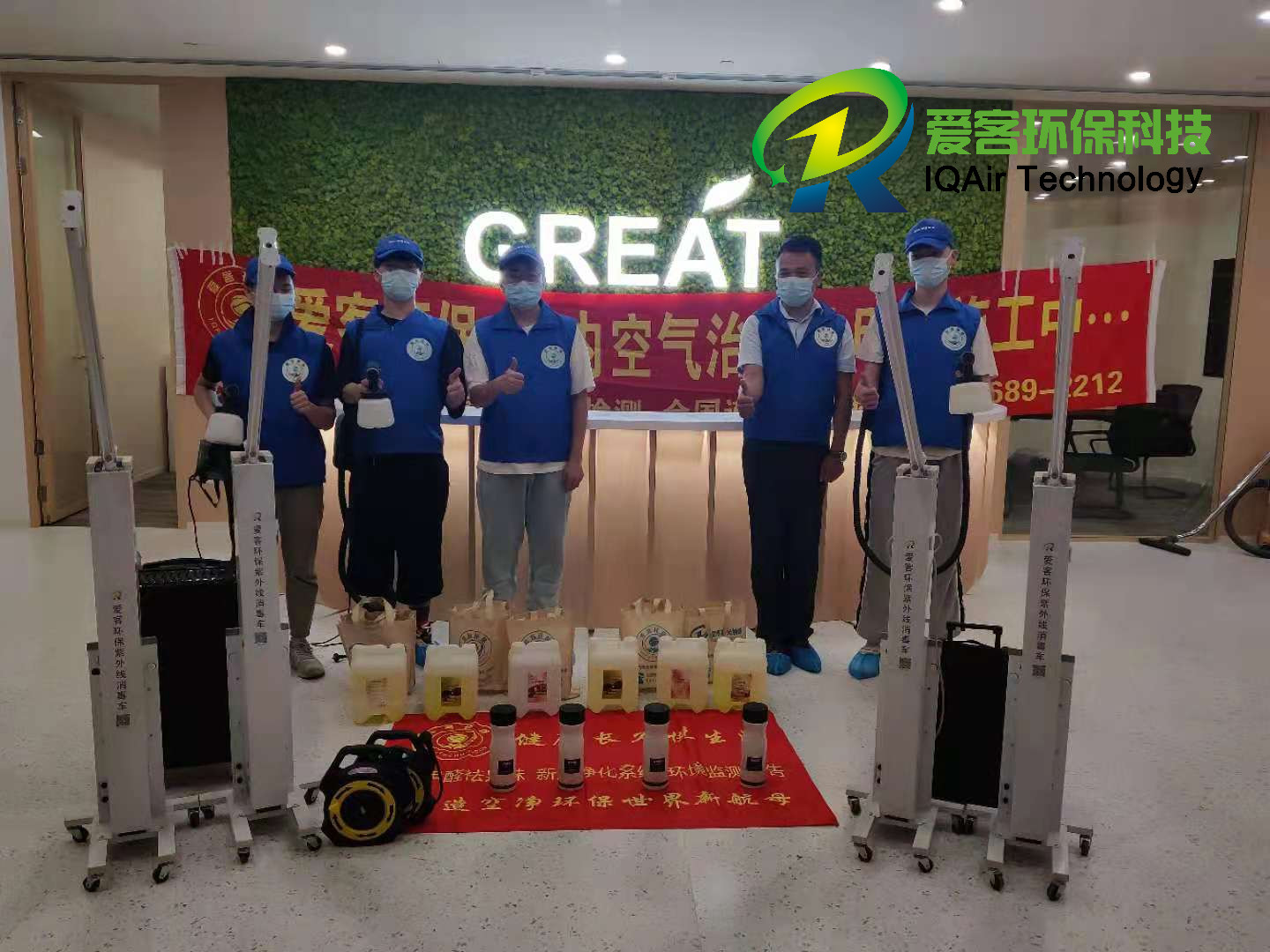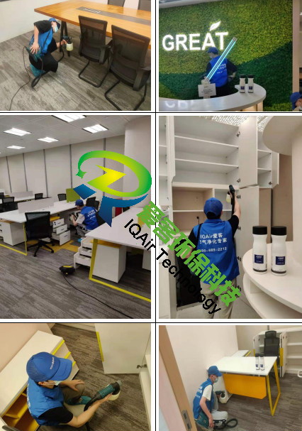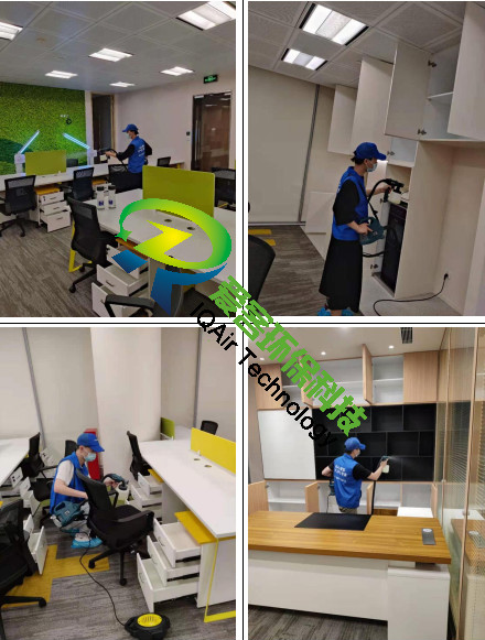 愛客工程師們針對(duì)辦公區(qū)地毯、柜體、家具物表逐一噴灑愛客濃縮型異味分解酶(食品級(jí))與強(qiáng)力TVOC清除劑(食品級(jí)),以消除化學(xué)異味分子,降解甲醛及TVOC。并結(jié)合紫外線燈進(jìn)行殺菌消毒治理。