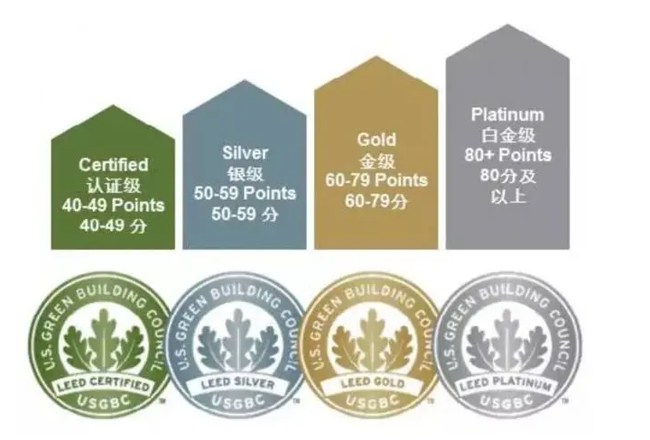 并根據(jù)每個方面的指標(biāo)進(jìn)行打分(總分110分),綜合得分結(jié)果,將通過評估的建筑分為白金、金、銀和認(rèn)證級別。