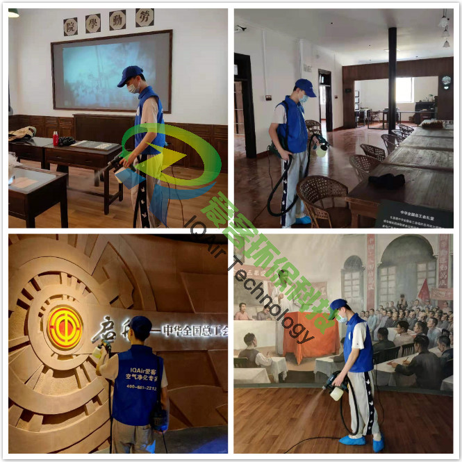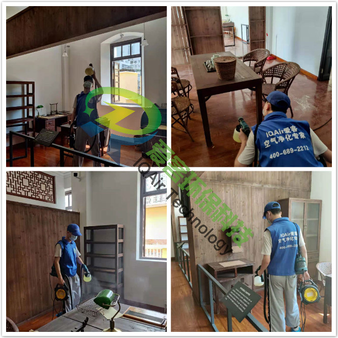 愛客工程師們對紀(jì)念館一、二樓展區(qū)地板、墻面、翻新門窗表面逐一噴灑愛客濃縮型異味分解酶(食品級)與強力TVOC清除劑(食品級),以消除化學(xué)異味分子,降解甲醛及TVOC。并結(jié)合紫外線燈進行殺菌消毒治理。