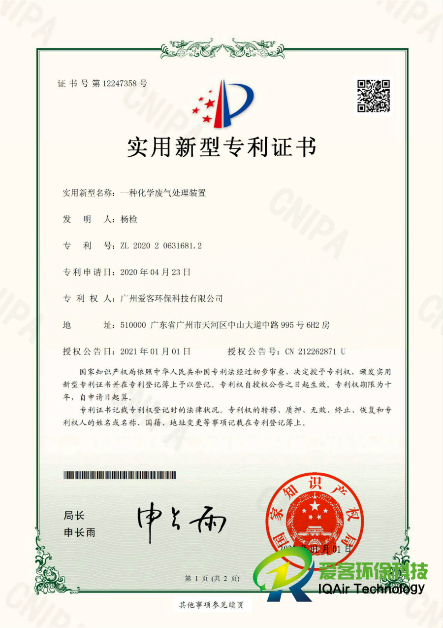 廢氣處理裝置專利證書
