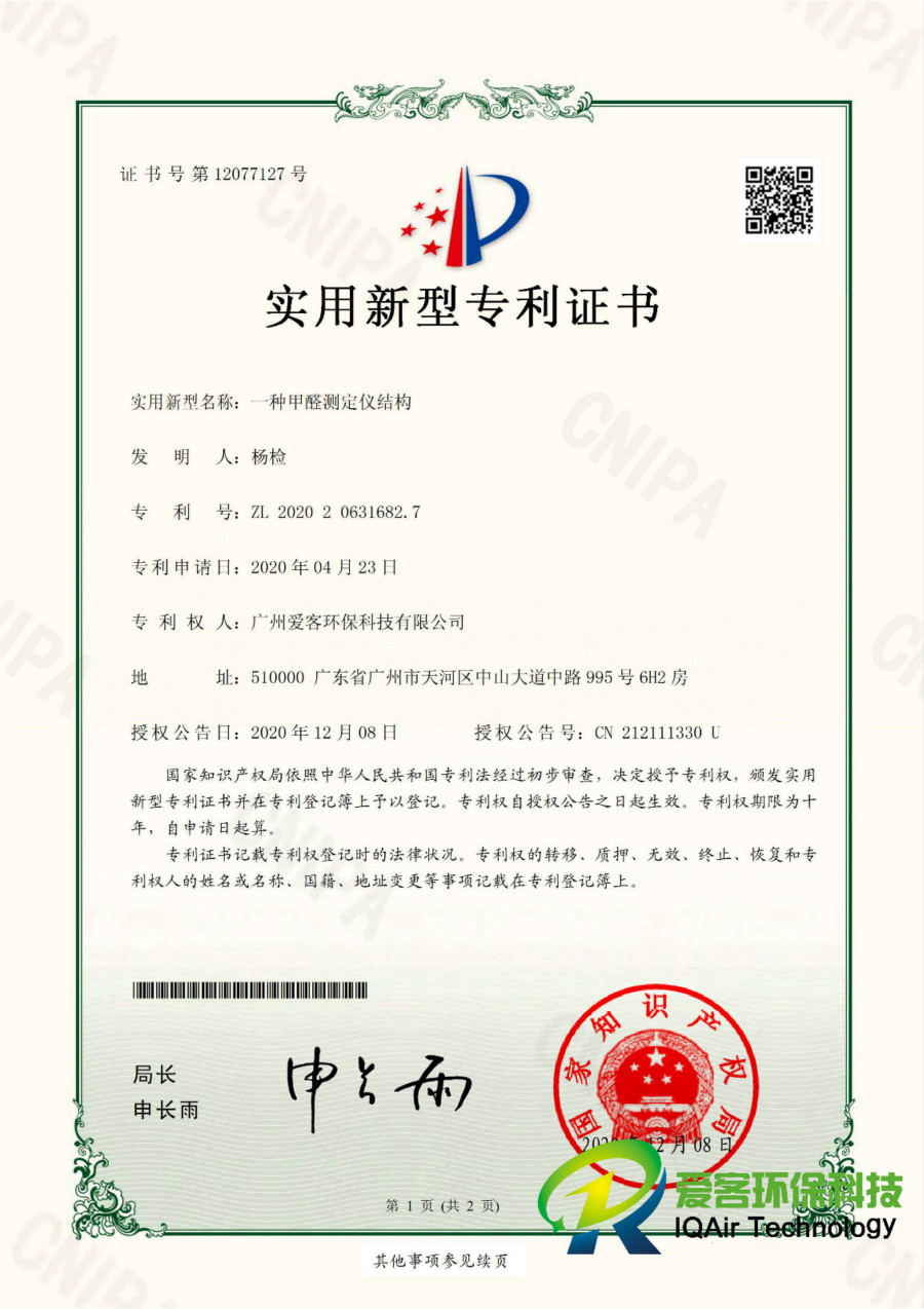 甲醛測定儀專利證書